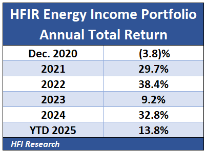 After a busy four years since the HFIR Energy Income Portfolio’s inception five years ago, 2025 turned out to be a surprisingly quiet year. We made no trades and harvested cash, keeping our positions in 14 holdings unchanged. I also carried over a cash position that increased to 10.9% over the course of the year.