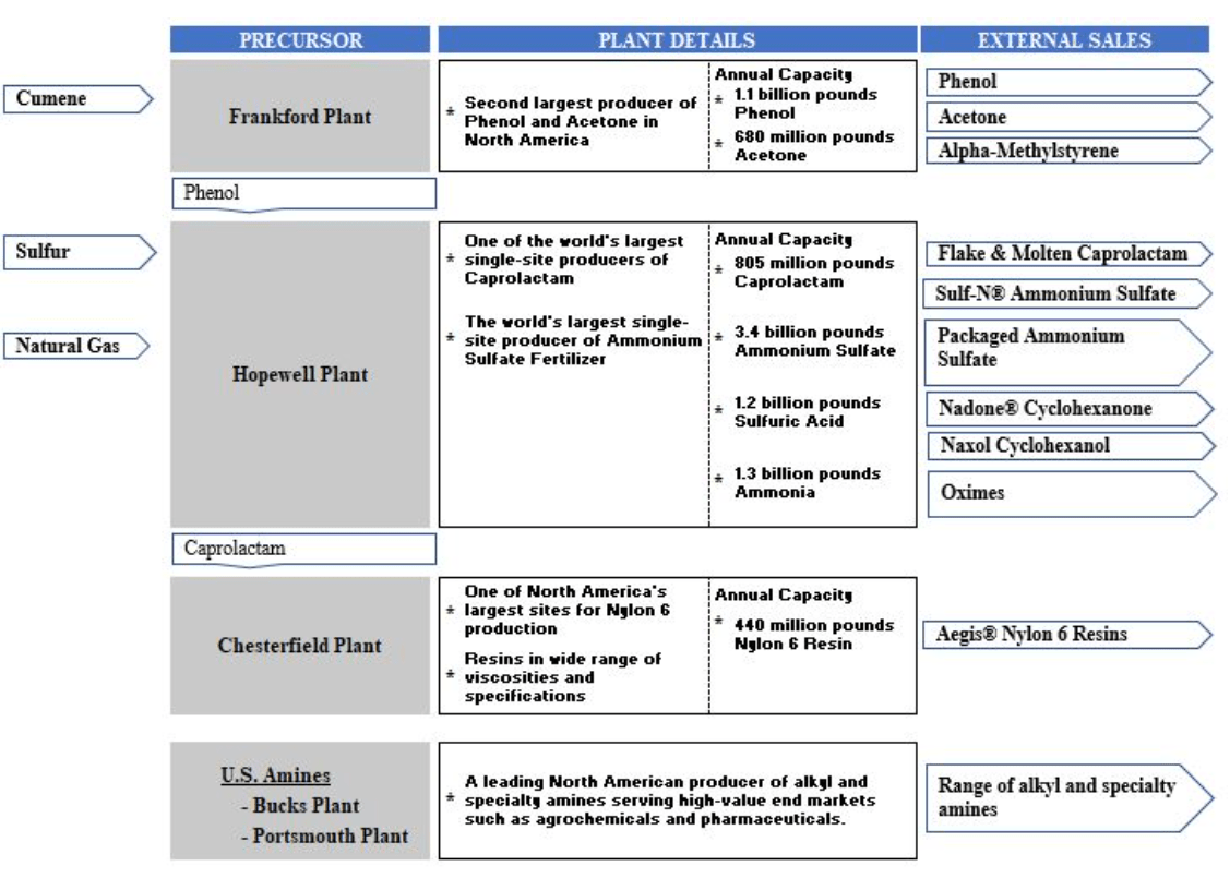 ASIX operates an integrated chemical manufacturing chain with five production sites across the U.S. The company converts cumene, ammonia, sulfur, and other feedstocks into nylon 6 resin, caprolactam, ammonium sulfate, and various phenol and acetone-based intermediates. Through its vertical integration, it captures value at each step of the production chain, lowering unit costs and improving margins.