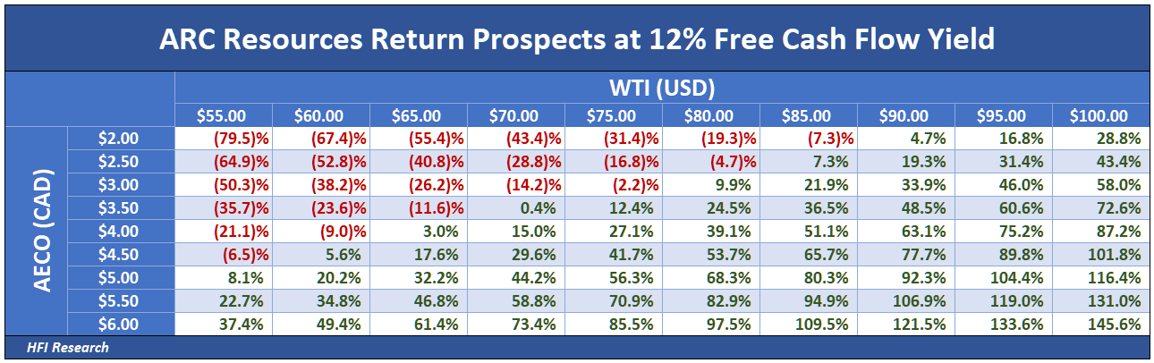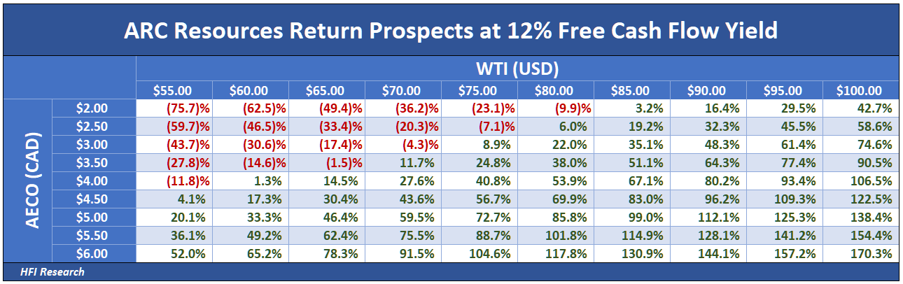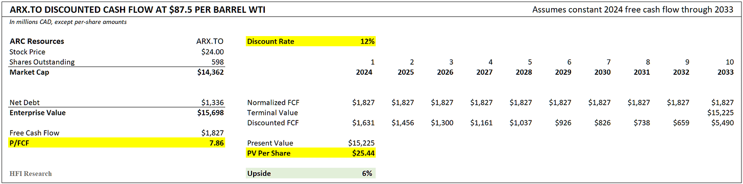 ARC’s current free cash flow yield on its 2024 production and C$1.3 billion of capex suggests its shares are slightly overvalued. Assuming current commodity prices, the shares trade at a 10.8% free cash flow yield. We consider 12% to be an appropriate free cash flow yield for an E&P, hence the overvaluation.