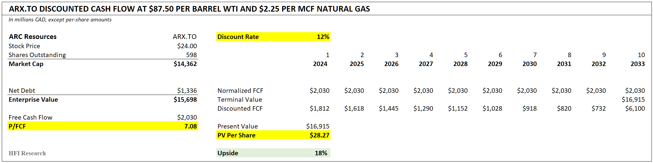Using our commodity assumptions of $87.50 per barrel WTI and C$2.25 per mcf natural gas and maintenance capex of C$1.3 billion, our discounted cash flow valuation implies ARC shares are worth C$25.44, for 6% upside from ARC’s current share price of C$24.00.