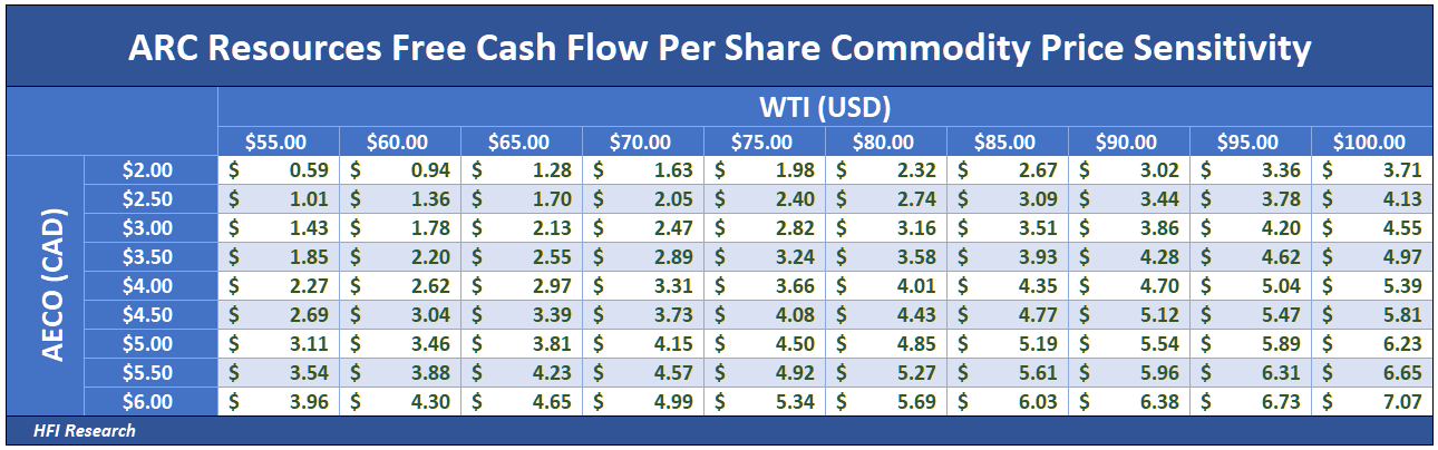 Below is ARC’s cash flow sensitivity under current commodity pricing, incorporating management’s 2025 production guidance and our C$1.4 billion estimate of maintenance capex.