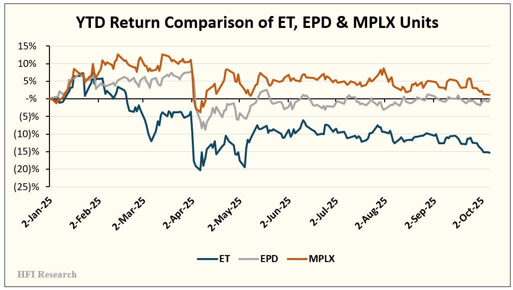 Year-to-date, ET units have significantly underperformed their large-cap midstream MLP peers, Enterprise Products Partners LP (EPD) and MPLX LP (MPLX). ET’s units have fallen 15.4% year-to-date. Over the same period, EPD units are flat, and MPLX units are up 1.2%.