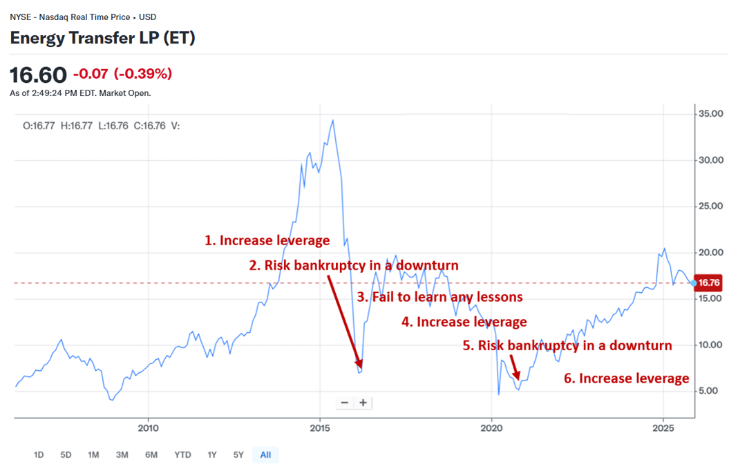 Over the past two decades, ET’s aggressive expansion through large organic projects and acquisitions caused it to regularly outspend its cash flow. On two occasions, high debt levels put ET unitholders at high risk of severe permanent loss.