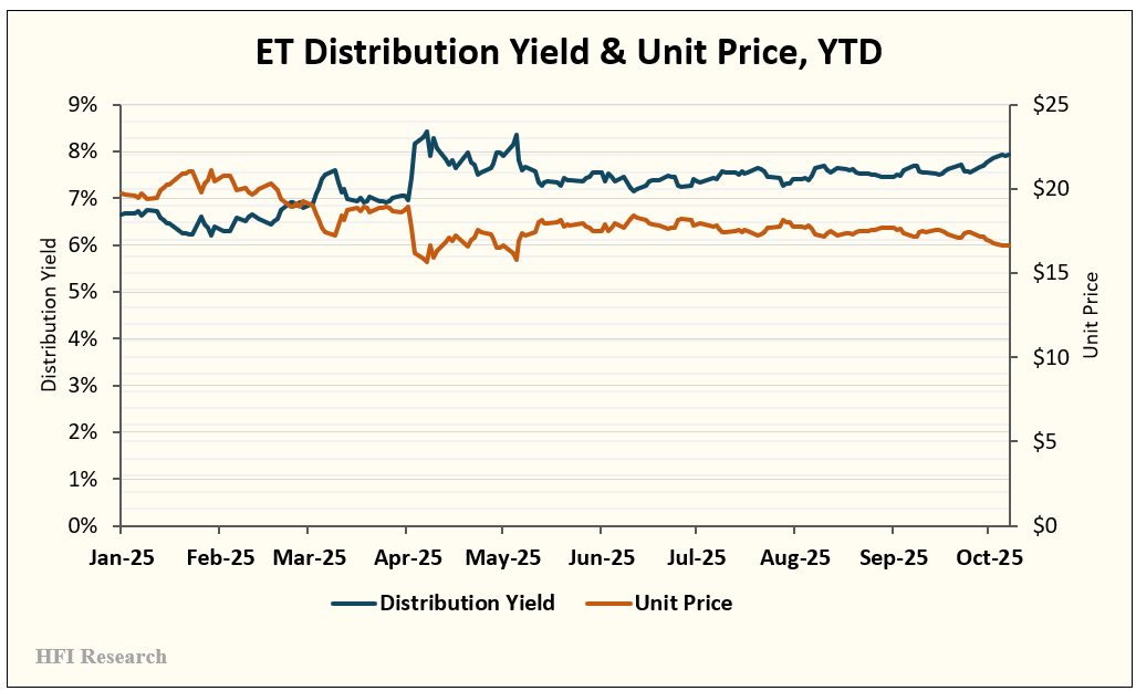 The decline in ET’s unit price has pushed its distribution yield up to 8.0%, well above the 6.8% and 7.8% yields on EPD and MLPX units, respectively. ET’s distribution yield is above its recent norm in the mid-to-low 7% range. The poor year-to-date performance of ET’s units and their rising distribution yield are illustrated below.