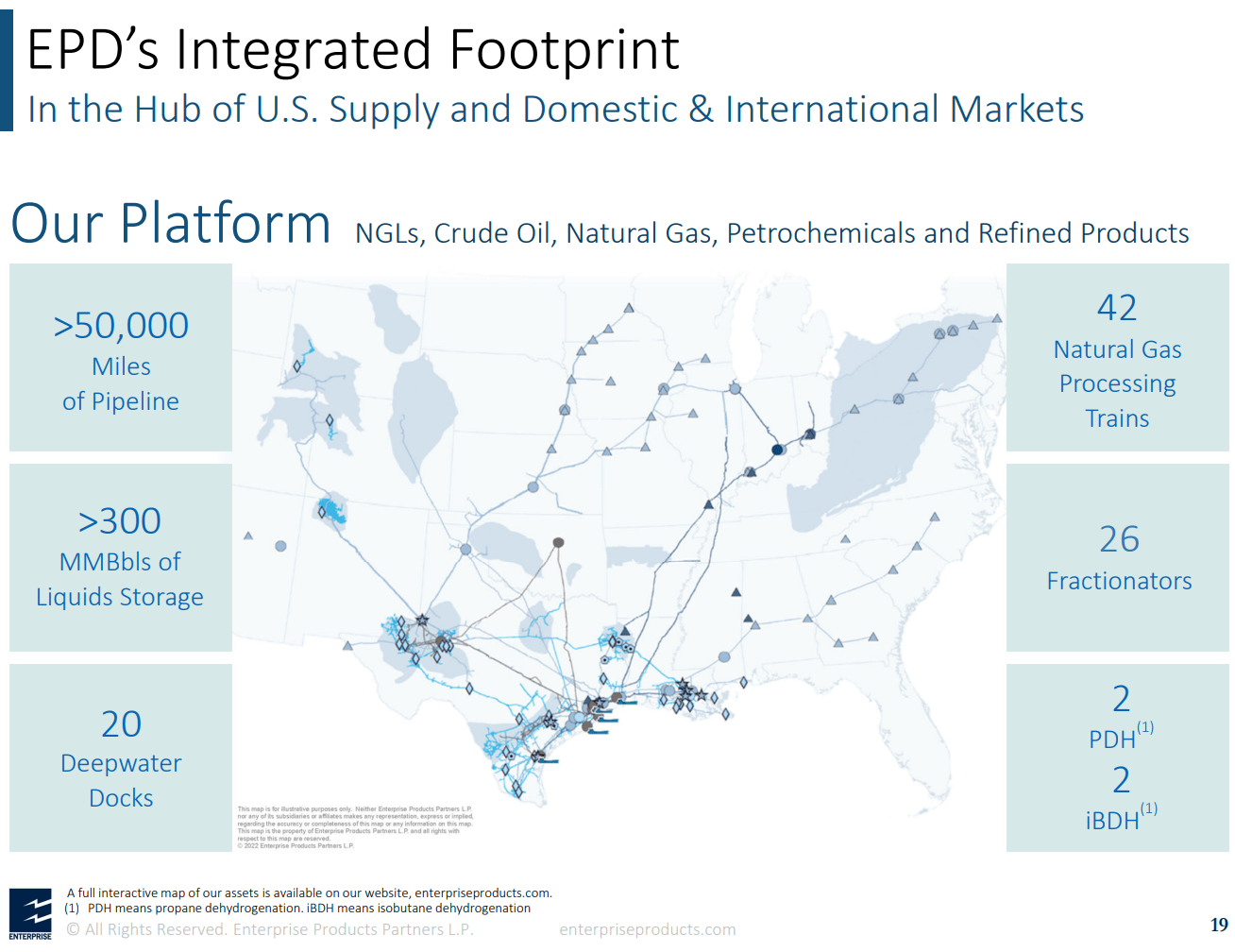 EPD is a midstream oil and gas MLP with an enterprise value of $94.3 billion, making it the second-largest independent midstream operator after Energy Transfer LP (ET). In the first quarter, the company transported 12.3 million barrels of oil equivalent per day of crude oil, natural gas, NGLs, petrochemicals, and refined products. It fractionated 1.6 million barrels per day of NGLs while loading and exporting 2.3 million barrels per day of refined products and ethylene. Its vast operating footprint is shown in the map below.