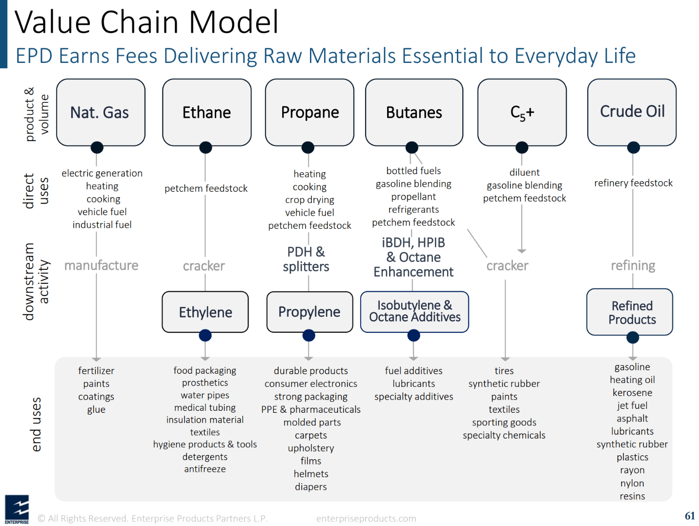 EPD’s activities span the entirety of the U.S. midstream value chain. Its integrated model is built to source hydrocarbons in shale basins and then transport, process, fractionate, store, and export them. It delivers hydrocarbon products directly to customers and provides petrochemical feedstock and petrochemicals to end users.