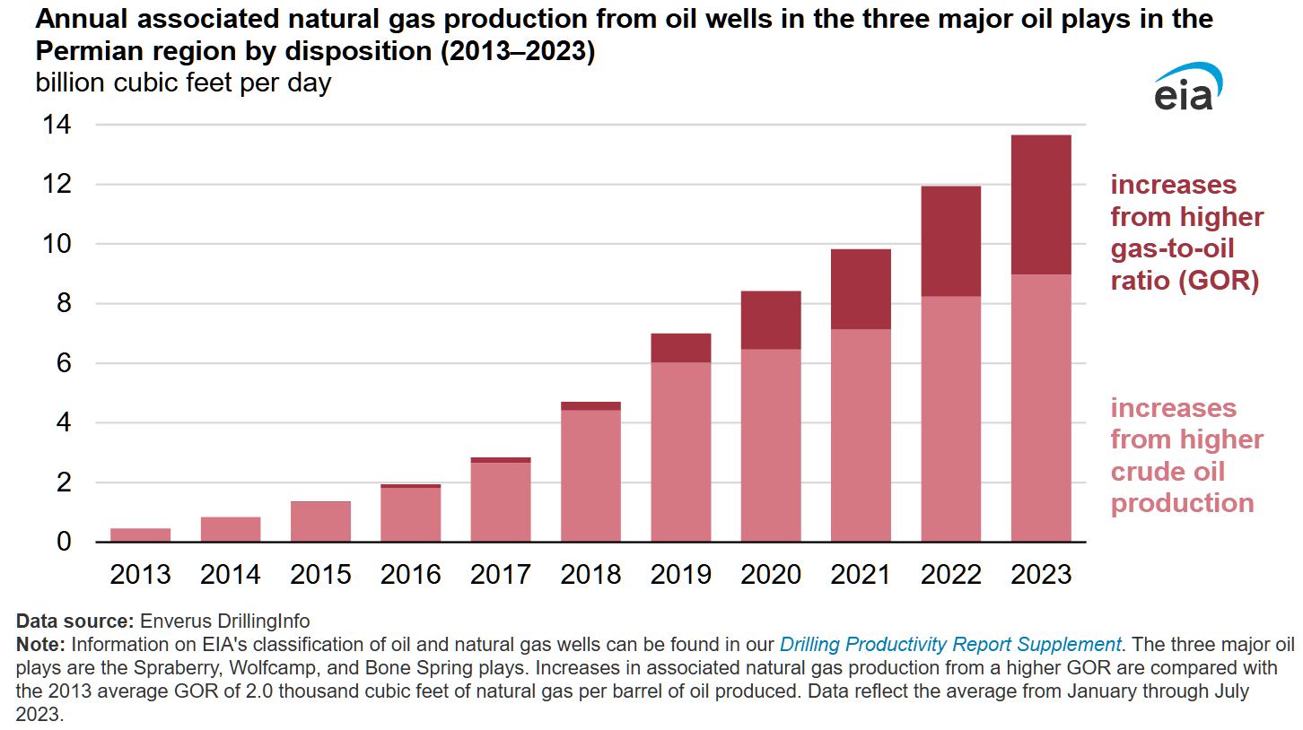 Natural gas and NGL volumes will increase due to drilling for natural gas, but also due to increasing quantities of natural gas produced as a byproduct of oil production. This “associated” natural gas production is insensitive to price. As such, it is likely to increase as long as takeaway and processing capacity is ample. The chart below shows the increasing share of U.S. natural gas production comprised of associated gas.
