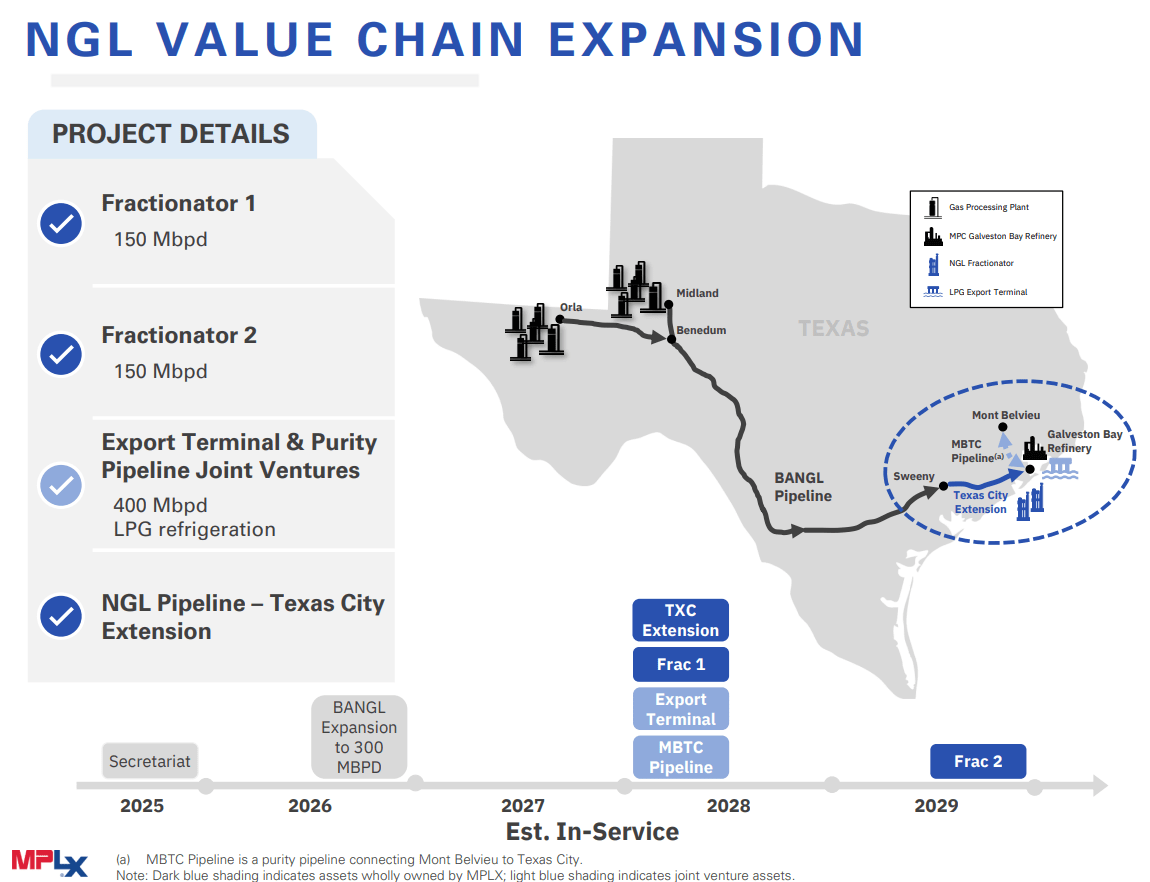 MPLX announced major growth joint venture projects with Oneok (OKE). One of these is a 50%/50% joint venture in a 400,000 bbl/d LNG export terminal, and the other is an NGL pipeline that will service the export terminal. The pipeline is being built, operated, and is 80% owned by OKE and 20% owned by MPLX.