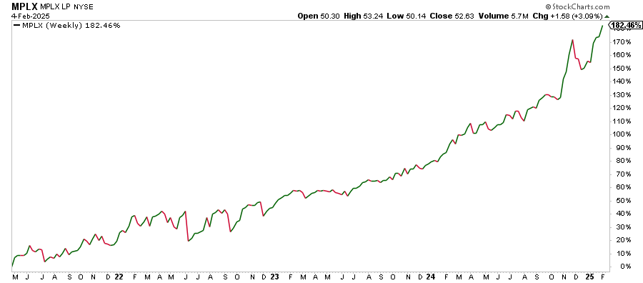 Over the past few years, however, we've been pleasantly surprised. MPLX has actually invested closer to $2 billion per year of capex instead of its guidance of closer to $1 billion. The result has been greater than expected Adjusted EBITDA growth, which, in turn, has driven greater than expected distribution growth. In November, MPLX increased its quarterly distribution by 12.5%, its third distribution increase of at least 10% in as many years.
