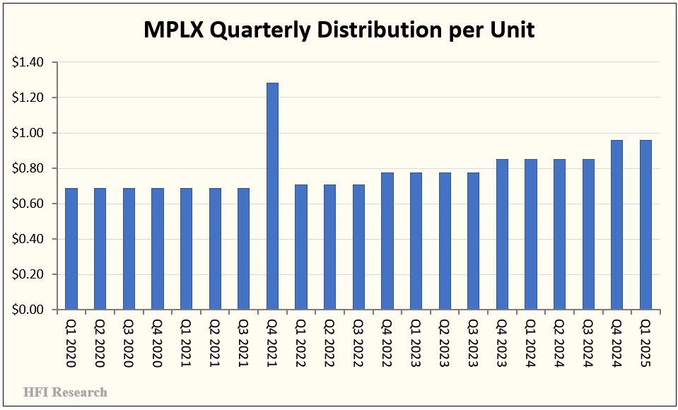 We remain steadfast holders of MPLX units. Over at least the next three years, we expect mid-to-high single-digit cash flow and distribution growth. The units will remain a ballast in our HFIR Energy Income Portfolio.