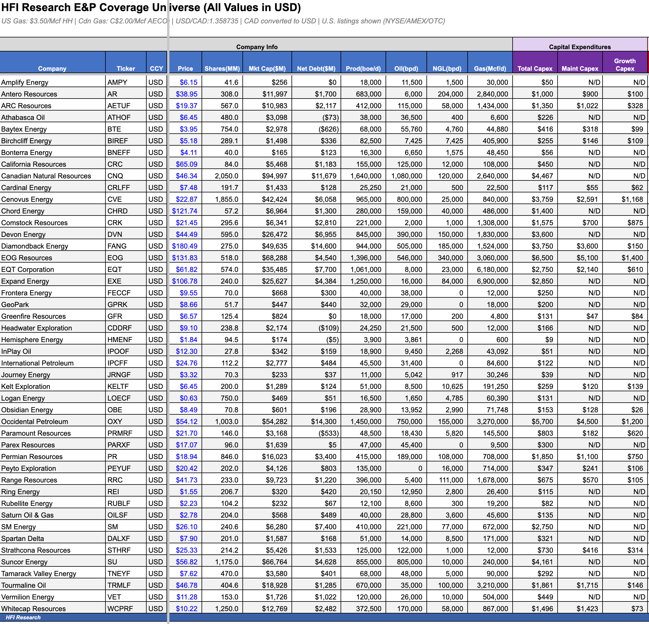 The spreadsheet data provides important information on investment opportunities among the stocks in our E&P coverage universe, including their potential upside and downside from current prices.