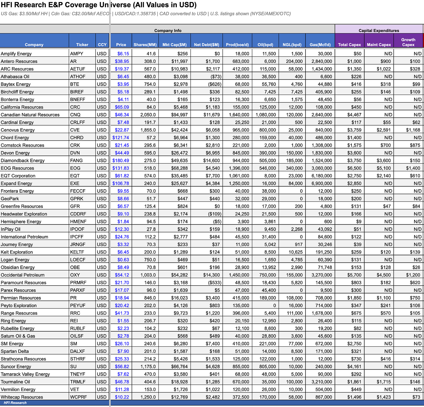 The HFIR Coverage Universe spreadsheet has been revised and updated. The spreadsheet ranks 46 E&Ps covered in our articles over the past few years and can be found at the bottom of this article.