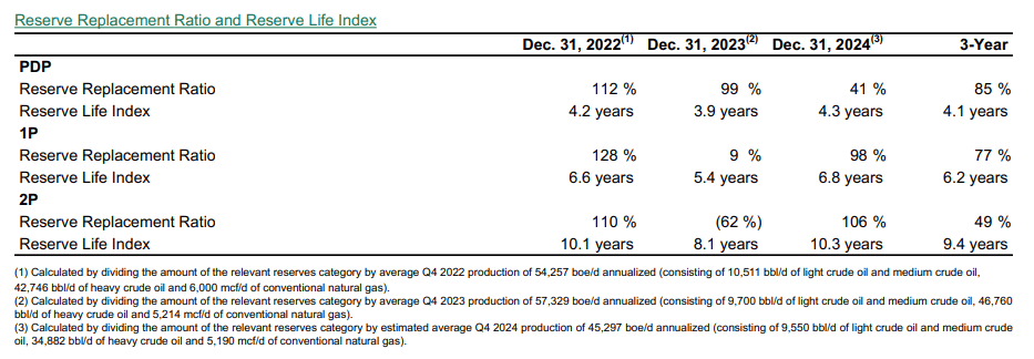 Parex further disappointed investors in 2024 by failing to replace PDP lost to production. In fact, PDP reserve replacement was only 41% during the year. Proved reserves were flat year-over-year, at 112.1 million barrels. Proved reserves have a life of 6.2 years, and proved-plus-probable reserves span 9 years at the 2025 average production rate.