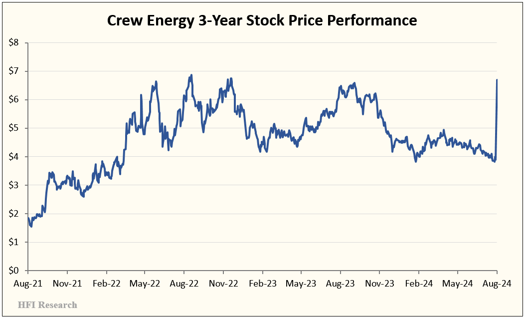 The market cheered the deal. Tourmaline’s shares traded 4.2% higher after today’s announcement, to $60.73. The deal sparked a rally in other Canadian gas-weighted intermediate E&Ps as investors used the deal’s metrics to imply that Crew’s peers were undervalued.