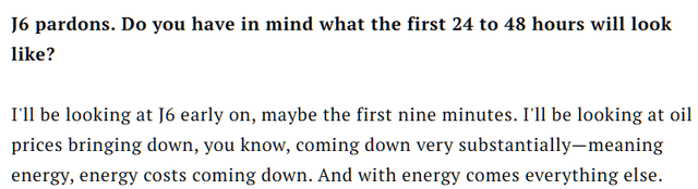 The culprit for today's price action is Trump’s recent comments in his Time Magazine "Person of the Year" interview, in which he repeated his intention to lower energy prices, as shown in the excerpt below.