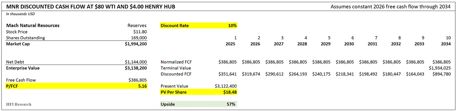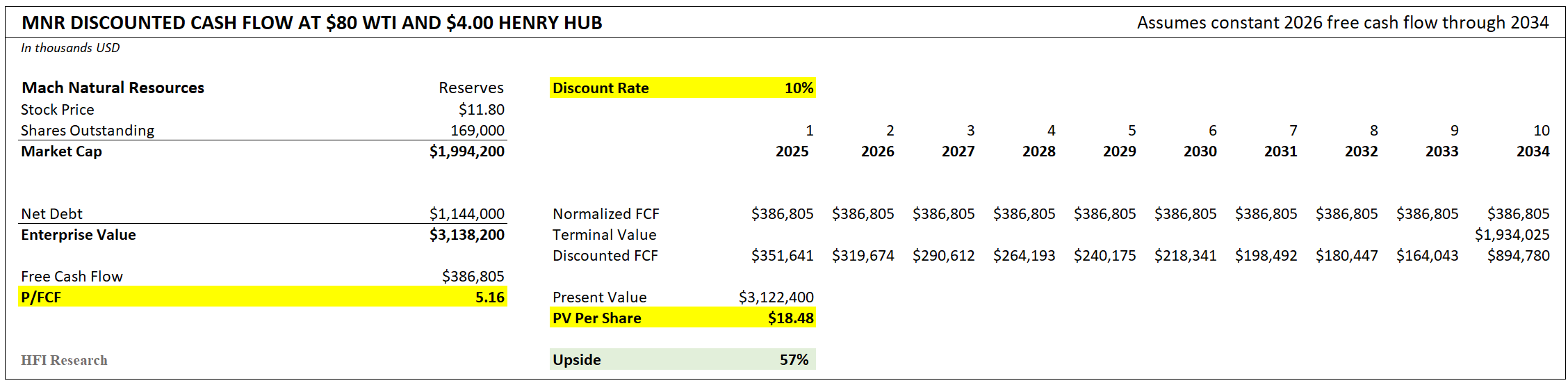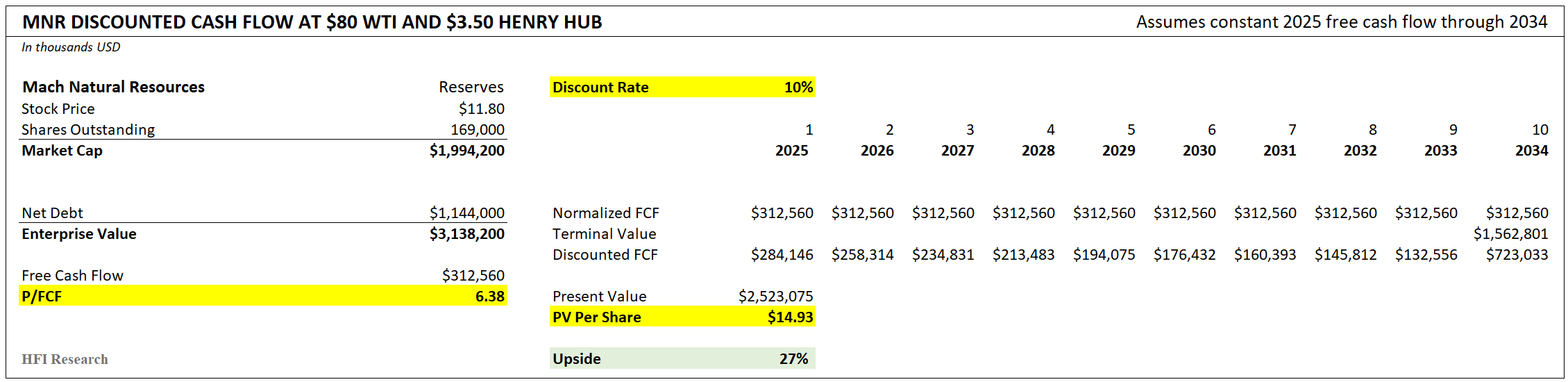 Assuming average long-term pricing of $3.50 per mcf natural gas and $80 per barrel WTI, the units are worth $14.93, implying 27% upside. This valuation cuts MNR’s terminal value in half to be conservative.