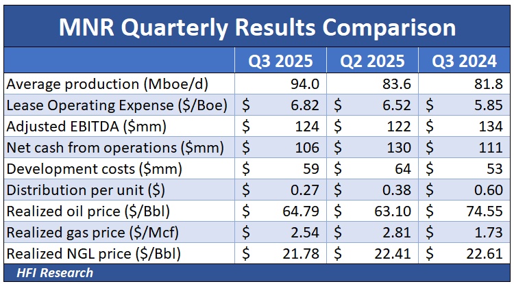 The acquisitions caused MNR’s production in the third quarter to jump to 94,043 Boe/d from 83,582 Boe/d in the previous quarter and 81,804 in the year-ago quarter. Third-quarter production was 21% oil, 23% NGLs, and 56% natural gas.