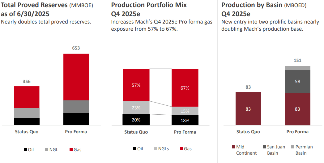 The company’s reserves and production have emerged from the deals with a higher gas content. Natural gas now accounts for 67% of PDP, up from 54%. Production in 2026 is expected to be 71% natural gas, up from 53%. The chart below shows MNR’s heavier natural gas weighting of its assets.