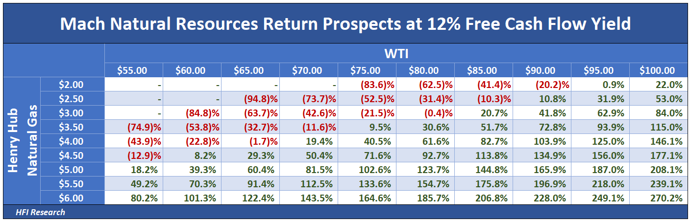 The following table illustrates the returns available to MNR unitholders assuming a 12% free cash flow yield at different commodity prices. The unit value really takes off once Henry Hub natural gas prices are sustained above $4.00 per mcf and WTI heads above $80 per barrel.