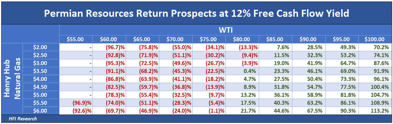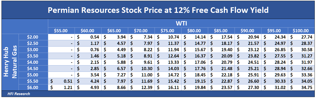 However, PR’s lower gross margins and higher corporate expenses relative to Diamondback give it an edge in terms of upside cash flow torque to higher commodity prices. The following table shows PR’s stock price at different commodity prices assuming it trades at a 12% free cash flow yield, which, we should add, is greater than its current free cash flow yield.