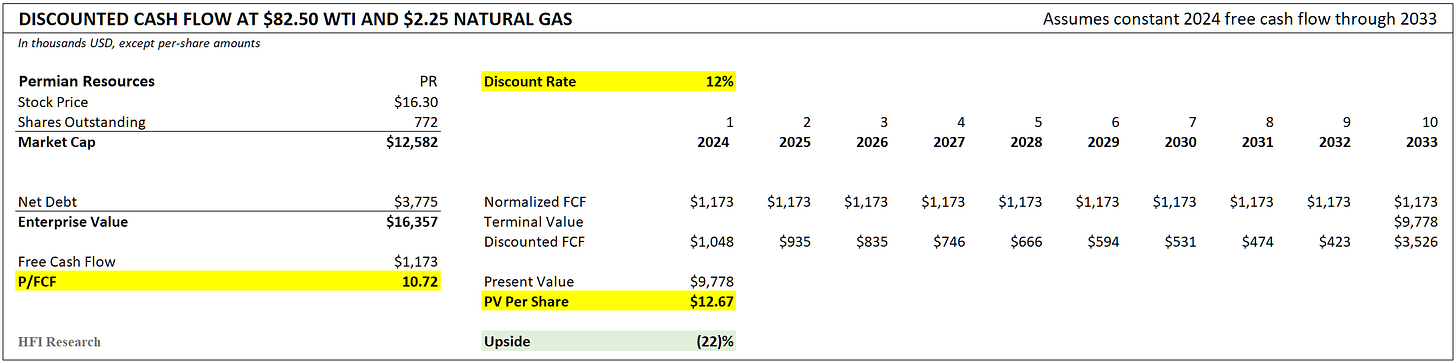 If we discount PR’s free cash flow by 12% annually over the next ten years, PR shares imply 22% downside from their current price.